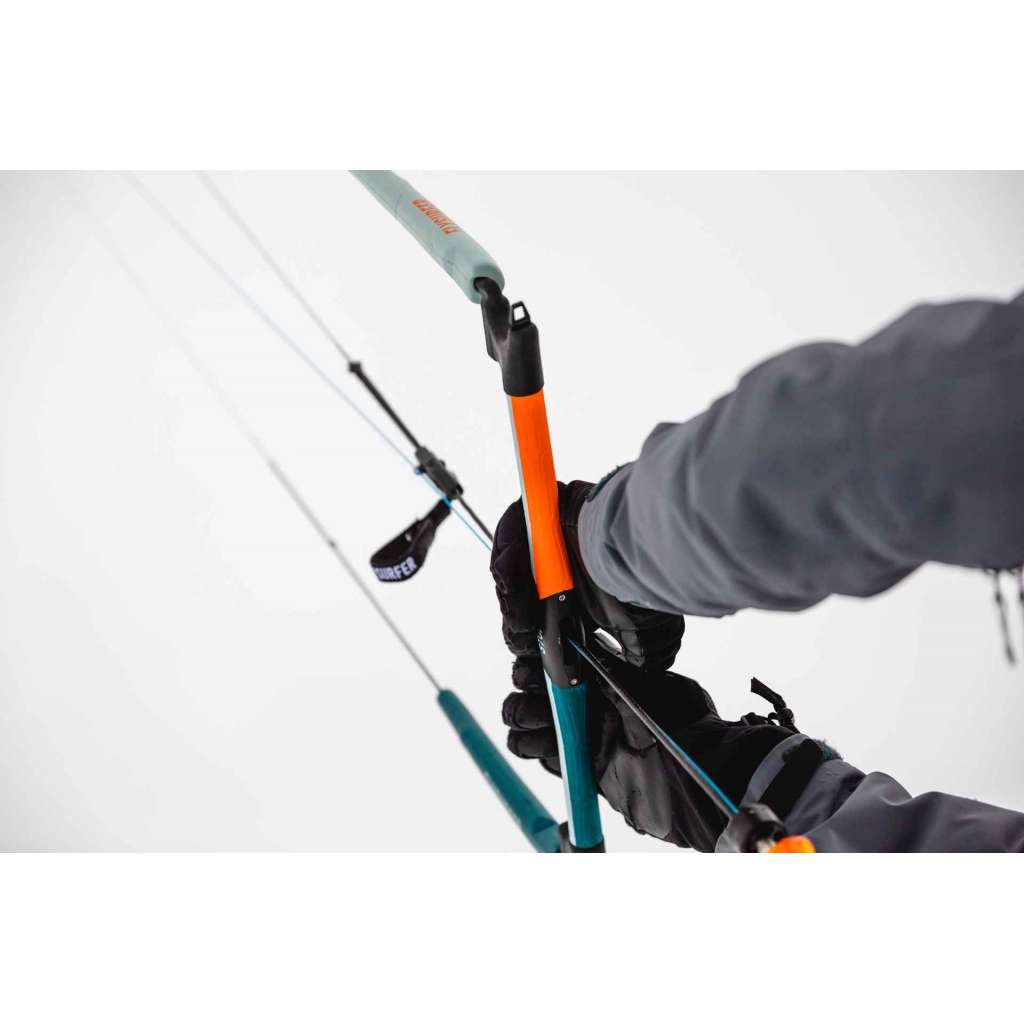La CONNECT2 est une barre 4 lignes avec sécurité sur un avant. Un code couleur permet de distinguer les avants et arrières et le côté droit du côté gauche. Elle ne pèse que 840gr. (lignes comprises) et permet d‘adapter une ligne de freins. Les lignes font 21m (14+7m). Les avants peuvent être dévrillés à la main juste au dessus du chicken loop.