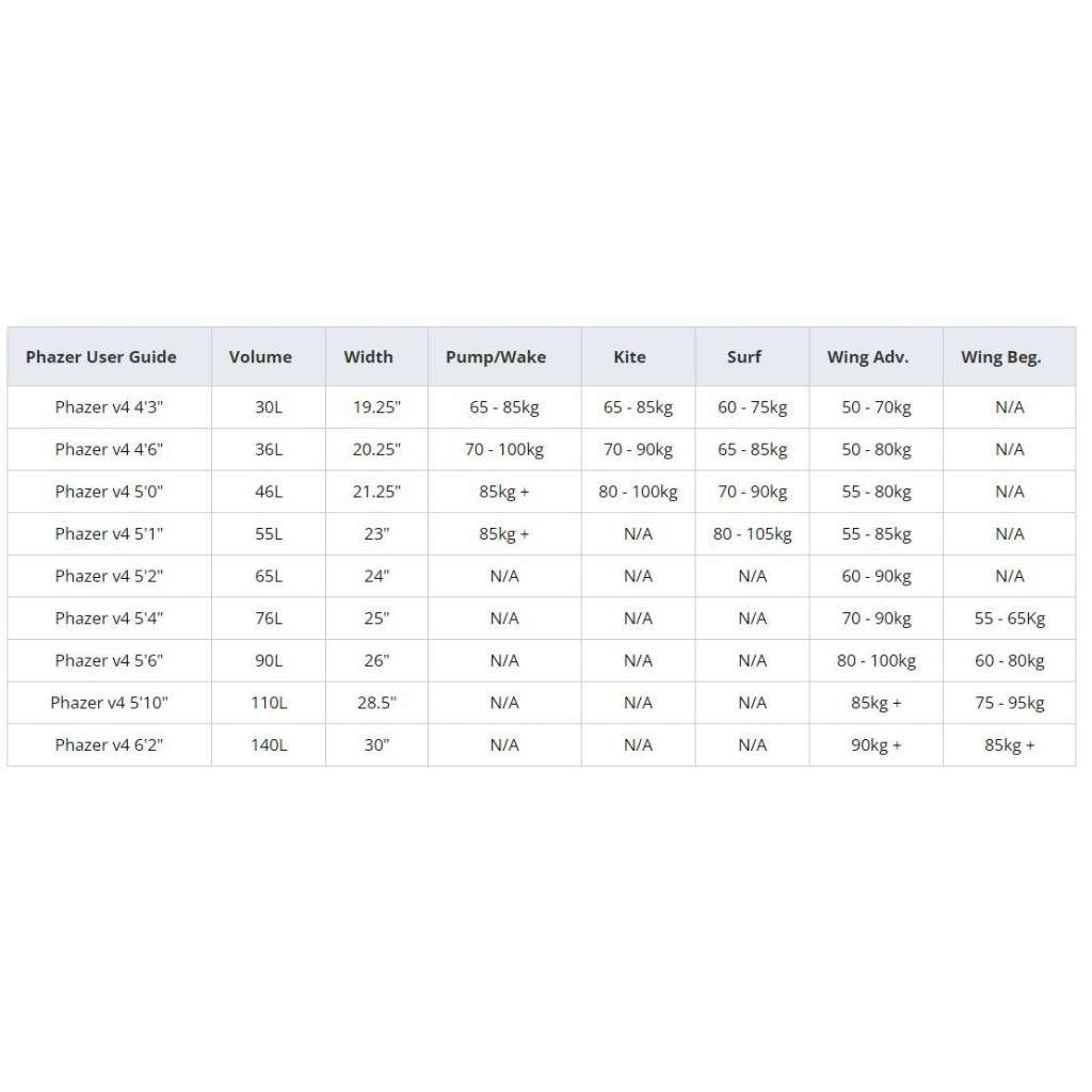 | Phazer v4 | 46L | 5'0" | 21.25" | 4.00kg | 85kg + | 80 - 100kg | 70 - 90kg | 55 - 80kg | N/A |