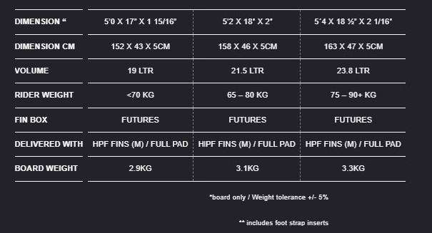| Taille (ft) | Volume (L) | Poids (kg) | Dimensions (cm) | Poids du rider (kg) |