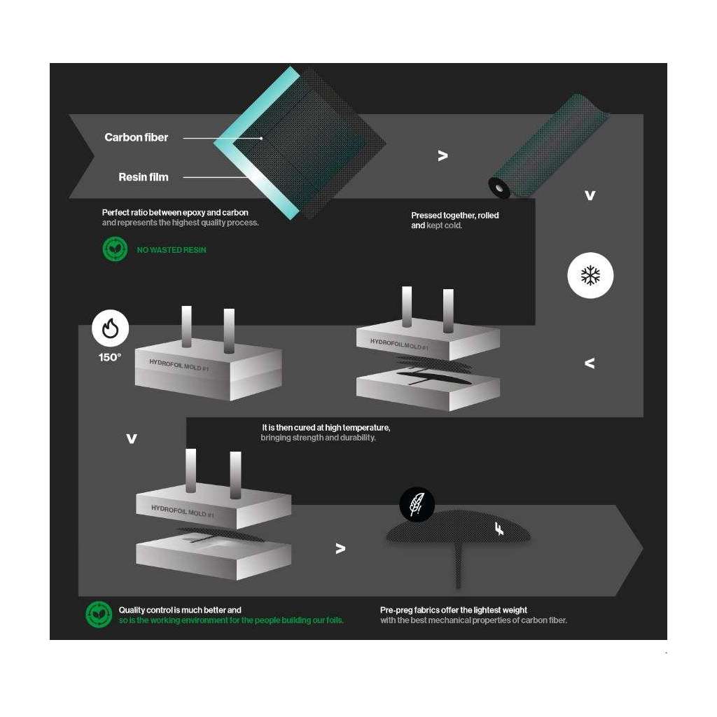 Fabriqué en carbone pré-preg avec la structure Monobloc, le foil est à la fois très léger et résistant. Cette configuration offre une meilleure transmission de la charge et une meilleure rigidité à travers les différentes parties pour un contrôle maximum. La connexion TITAN permet de raccorder un mât en aluminium ou en carbone, et le fuselage est divisé en deux parties pour faciliter le transport.