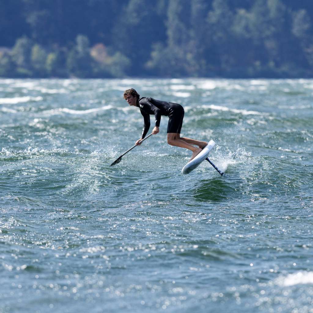 Hadou Brunner teste le F-One SK8 V2 750 cm² : carving, construction carbone améliorée, avis wingfoil et surffoil.